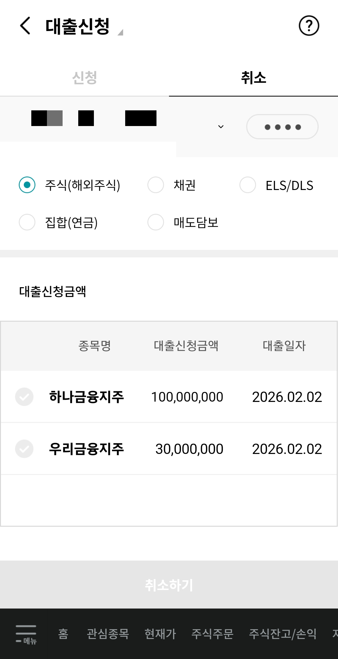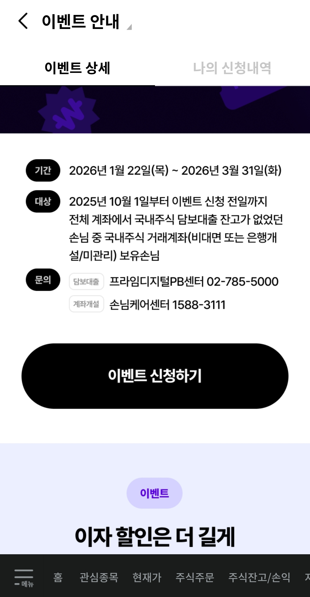 2025년 국내 주식을 매입하면서 보유 중인 QQQ와 VOO를 담보로 주식담보대출을 받았다. 당시 6개월 한시적 이벤트를 통해 연 3.9%라는 저렴한 금리를 적용받았다. 어느덧 6개월이 지나 만기 시점인 2월이 다가왔다. 며칠 전 만기 연장을 진행했는데, 이벤트 기간이 종료되면서 금리가 연 8.2% 수준까지 치솟았다. 높은 이자 부담에도 불구하고 우선은 연장을 할 수밖에 없었다. 그러던 중 하나증권에서 국내 주식 담보대출 이벤트를 다시 시작한다는 소식을 접했다. 이를 활용해 곧바로 대환대출을 실행했다.