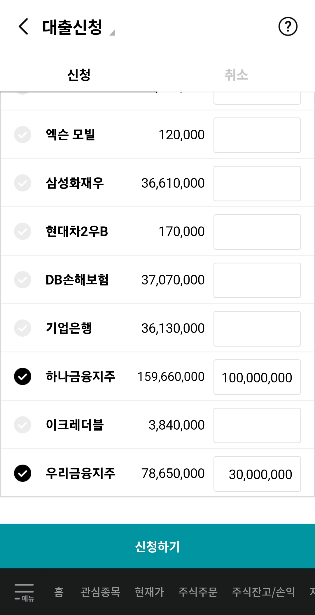 • 종목 선택: 대출 신청 화면에서 본인이 보유한 종목과 종목별 대출 가능 금액을 확인한다.