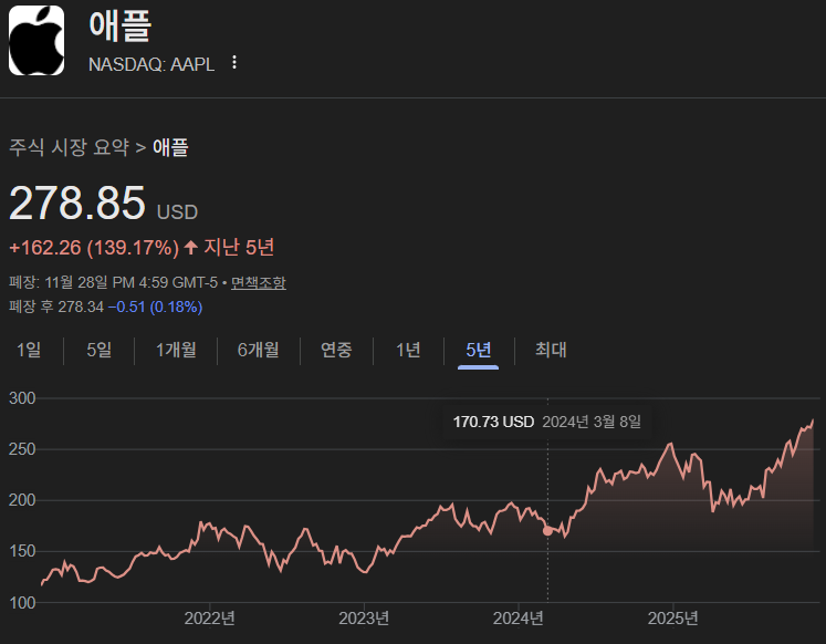 2021년 90달러에 매입하여 현재 285달러, 314%의 경이적인 수익률을 기록한 알파벳(GOOGL)은 내 포트폴리오의 빛나는 성과를 보여준다. 특히 나는 2021년부터 2024년까지 인내의 시간이 필요했고 현재까지 장기 보유하고 있었는데 최근 워렌 버핏이 매입했다. 이런 워렌 버핏의 최근 매입은 내가 선택한 종목이 좋았다는 확인을 받은거 같아서 기분이 좋다. 특히 이 종목에 대한 장기 보유의 확신을 더욱 강화시켰다.