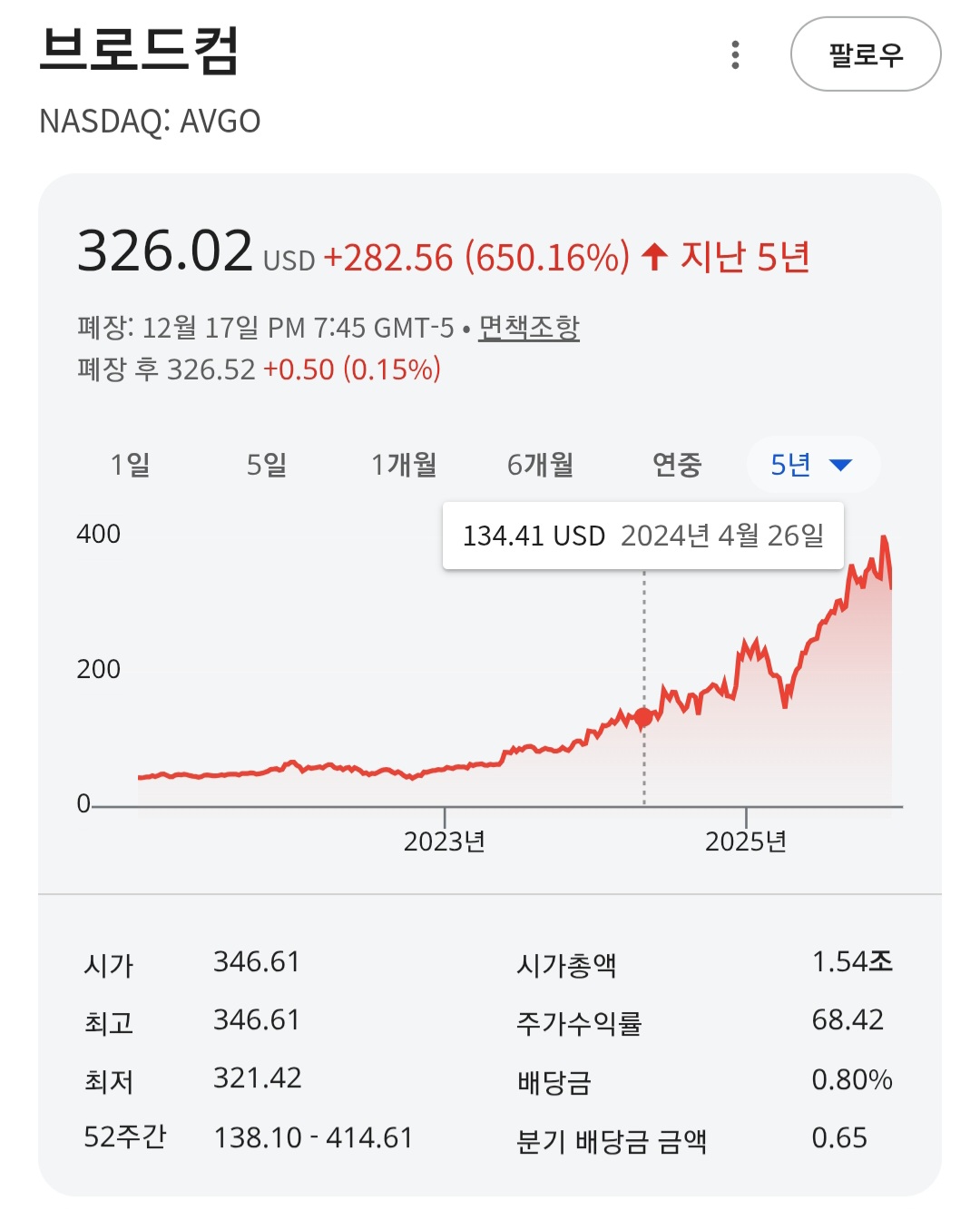 특히, 두 기업의 배당률(Dividends)을 비교해 보면 당시 브로드컴은 3.22%에 달했다. 그때 삼성전자의 배당률이 2% 수준이었음을 감안하면, 같은 반도체 섹터이면서, 배당 수익률이 더 높은 미국 기업이라는 점이 매력적이었다. 노후에는 무엇보다 안정적인 현금 흐름이 가장 중요하다고 판단했기에, 배당 성장이 기대되는 브로드컴을 매수하게 되었다.