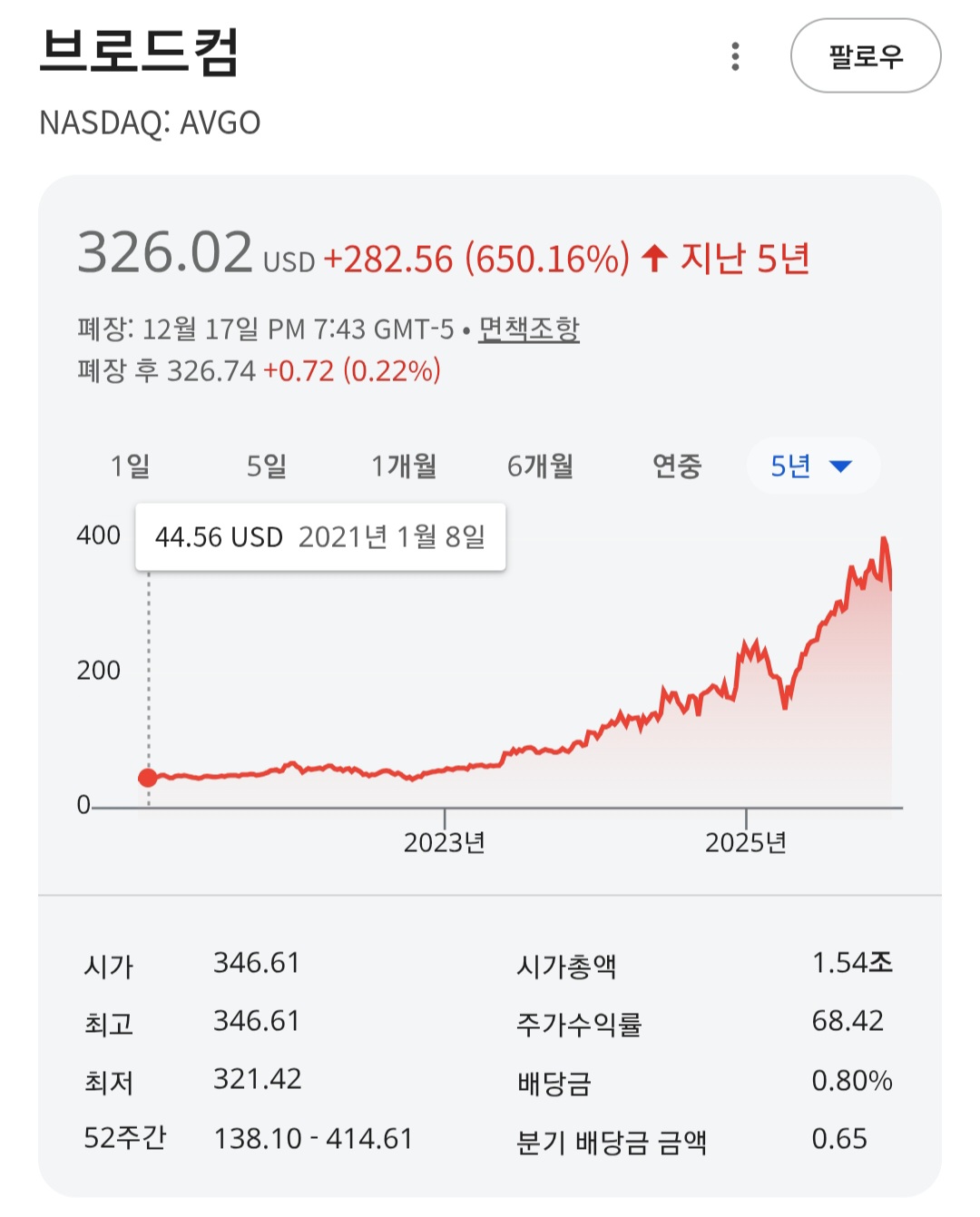 브로드컴 1차 매수는 2021년 1월이었으며, 당시 주당 약 44달러의 가격으로 1,000만 원 정도를 매수했다. 그런데 최근 차트를 보니 배당률이 0.08% 수준까지 낮다. 만약 내가 지금 브로드컴을 처음 알게 되었다면, 이렇게 낮은 배당 수익률 때문에 매수를 고민했을 것 같다. 그때 당시 나는 브로드컴을 배당주로 보았기 때문이다.