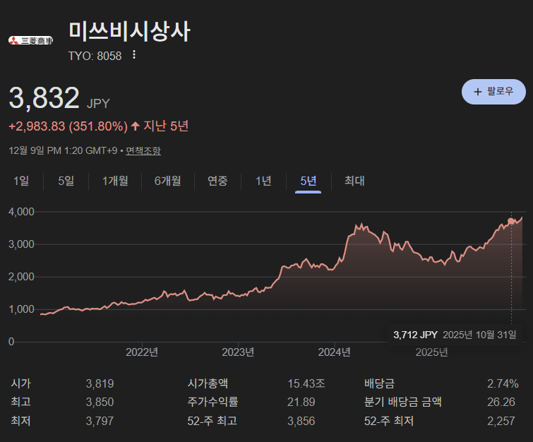 나는 워런 버핏이 일본의 5대 상사(미쓰비시 상사, 미쓰이 물산, 이토추 상사, 스미토모 상사, 마루베니)를 꾸준히 매입하고 있다는 사실을 5년 전부터 알고 있었다. 평소 워런 버핏이 새로운 종목에 투자하면 나 역시 해당 종목을 최소 1주씩 매입하며 관찰하는 습관이 있었지만, 이상하게도 이 일본 상사 회사들에는 별다른 관심이 가지 않았다. 돌이켜보면 이는 일본 시장에 대한 나의 또 다른 편견이었던 것 같다. 5년이라는 시간이 지난 지금에서야 그 기회를 놓친 것에 대한 후회가 밀려오지만, 투자는 언제나 '지금이라도 늦지 않았다'는 마음가짐이 중요하다고 생각한다. 늦었지만 이제라도 행동에 나서기로 결심하고, 일본 5대 상사에 조금씩이나마 투자하며 버핏의 통찰력을 따라가 보려 한다.