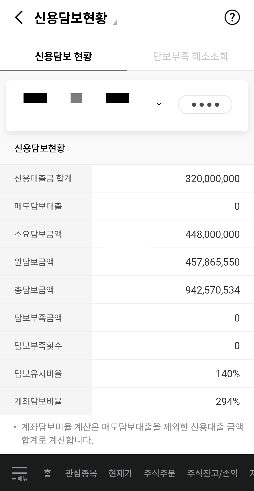 다음 문제는 주식담보대출이었다. 현재 잔액이 3억 3천만 원이다. 이크레더블 매도 대금으로 일단 천만 원을 상환했다. 앞으로도 현금이 생길 때마다 틈틈이 갚아나갈 계획이다. 주식담보대출은 주가가 오를 때는 레버리지 효과로 수익을 키워주지만, 주가가 하락하면 담보 가치가 떨어지면서 추가 담보 요구나 반대매매라는 최악의 상황으로 이어질 수 있다. 특히 국내주식은 미국주식에 비해 변동성이 크고 하락 속도가 빠른 경우가 많아 담보대출의 위험성이 더 두드러진다. 내 계좌의 신용담보현황을 보면 하락 전에는 담보비율이 305%였으나, 시장이 하락하며 어느덧 200%대 후반까지 내려가고 있다. 아직은 크게 걱정할 수준은 아니지만, 이번에 국내 주식의 변동성을 직접 겪어보니 철저한 관리가 절실하다는 생각이 든다. 변동성 앞에 장사 없다는 말처럼, 멘탈뿐만 아니라 수치상으로도 더 단단한 방어벽을 쌓아두어야 할 것 같다.