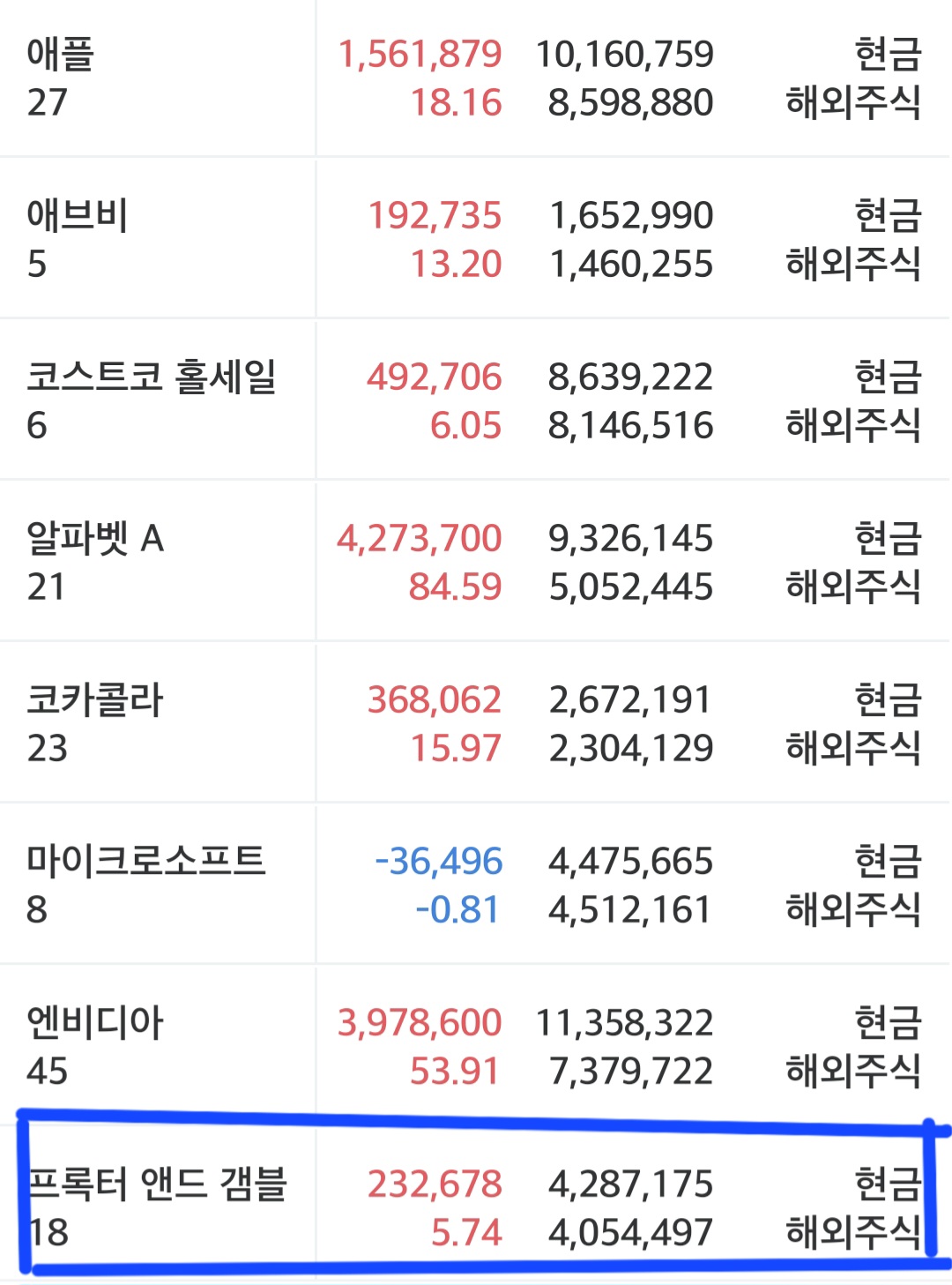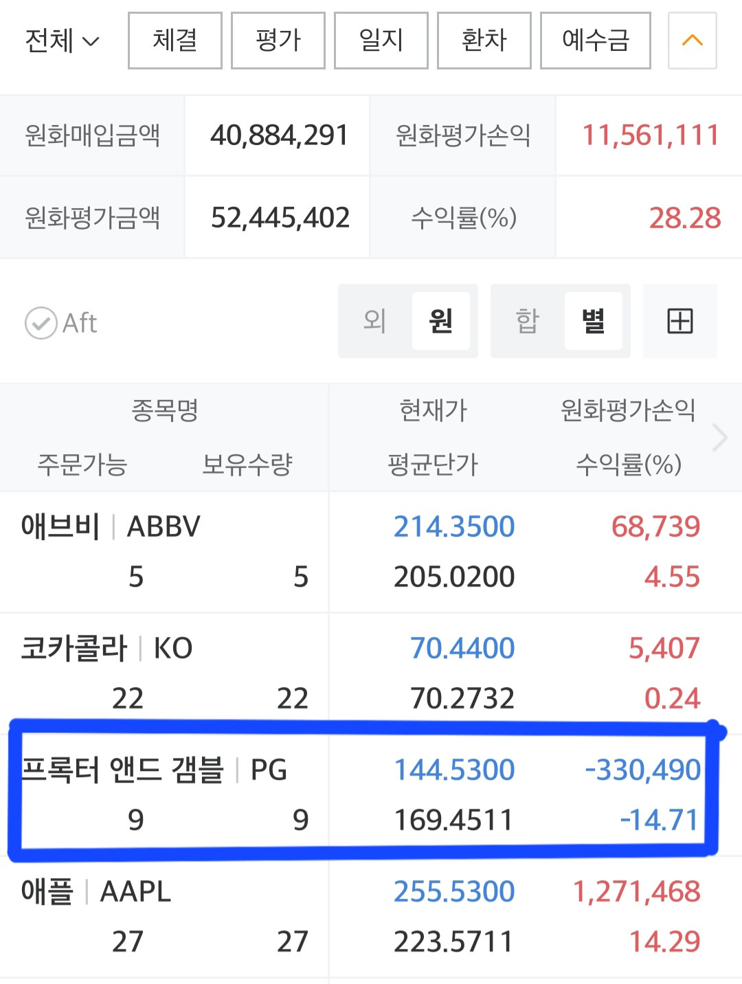 2026년 2월은 명절이 있어서 그런지 시간이 더 빨리 지나가는 것 같다. 특히 어느 때보다 주식에 관심을 갖고 시작하는 사람들이 많아졌다. 예전 코로나 때와 비슷한 상황 같지만, 조금 다른 점은 정부에서 주식 시장의 활성화를 위해 노력하고 있다는 점이다. 너무 긍정적인 신호여서 나도 마음이 뿌듯하다. 국내 시장이 너무 좋아서 상대적으로 미국 시장이 안 좋아 보일 수 있지만, 사실 그렇지 않다. 나의 계좌를 보면 조금씩 우상향을 하고 있기 때문이다. 특히 그동안 마이너스 폭이 컸던 프록터앤드갬블(P&G)이 플러스권에 들어왔다. 조금은 성급할지 모르지만, 역시 나의 판단이 옳았다는 생각이 든다. 아래 계좌 이미지를 보면 프록터앤드갬블이 -14%였을 때 물타기를 해서 -7%까지 낮췄고, 오늘 날짜로 +5% 수익권에 들어왔다. 내가 왜 물타기를 했는지에 대한 글을 아래 첨부한다.