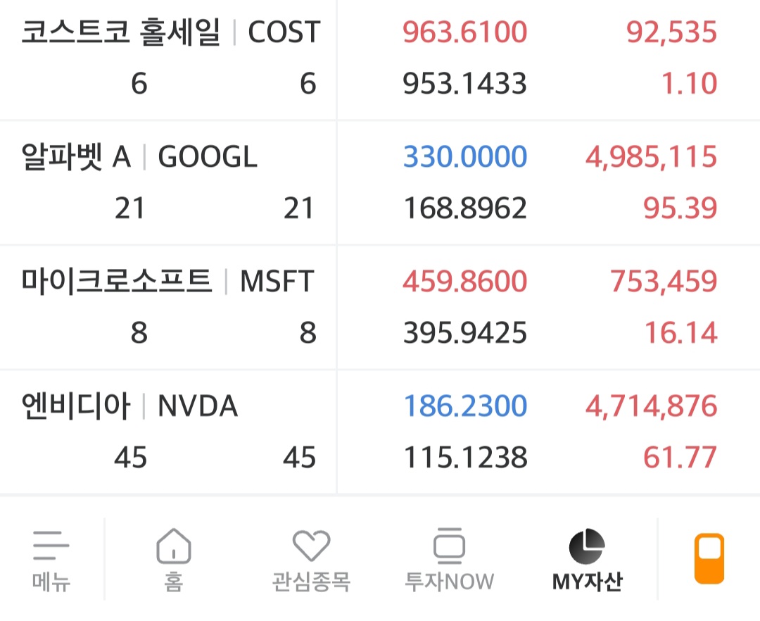 아래 계좌에서 보면 엔비디아, 애플, 마이크로소프트, 알파벳A의 성장주와 애브비, 코카콜라, 프록터앤드갬블, 코스트코홀세일 배당주로 구성했다. 아직 1년이 안되었지만 생각보다 성과가 좋다. 단지 프록터앤드갬블이 -14%를 찍고 있고 현재는 수익률이 제일 안 좋다.
